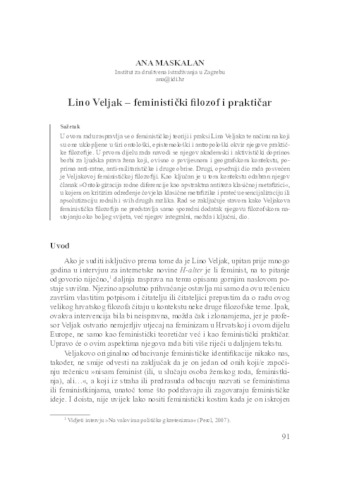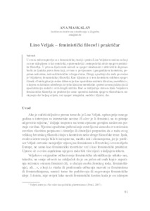 IN CROATIAN: U ovom radu raspravlja se o feminističkoj teoriji i praksi Lina Veljaka te načinu na koji su one uklopljene u širi ontološki, epistemološki i antropološki okvir njegove praktičke filozofije. U prvom dijelu rada navodi se njegov akademski i aktivistički doprinos borbi za ljudska prava žena koji, ovisno o povijesnom i geografskom kontekstu, poprima anti-ratne, anti-militarističke i druge obrise. Drugi, opsežniji dio rada posvećen je Veljakovoj feminističkoj filozofiji. Kao ključan je u tom kontekstu odabran njegov članak »Ontologizacija rodne diferencije kao apstraktna antiteza klasičnoj metafizici«, u kojem on kritizira određenje čovjeka klasične metafizike i prateću esencijalizaciju ili apsolutizaciju rodnih i svih drugih razlika. Rad se zaključuje stavom kako Veljakova feministička filozofija ne predstavlja samo sporedni dodatak njegovu filozofskom nastojanju oko boljeg svijeta, već njegov integralni, možda i ključni, dio. --------------- IN ENGLISH: This paper discusses the feminist theory and practice of Lino Veljak and the way in which they are integrated into the broader ontological, epistemological and anthropological framework of his practical philosophy. In the first part of the paper, his academic and activist contribution to the struggle for women's human rights is described, which, depending on the historical and geographical context, takes an anti-war, anti-militaristic or other shape. The second, more comprehensive part of the work is dedicated to Veljak's feminist philosophy. His article "Ontologization Of Gender Difference as An Abstract Antithesis to Classical Metaphysics" was determined paramount, in which he criticizes the definition of a man in the classical metaphysics and the accompanying essentialization or absolutization of gender and all other differences. The paper concludes with the view that Veljak's feminist philosophy is not just a secondary addition to his philosophical effort for a better world, but an integral, perhaps even crucial, part of it.