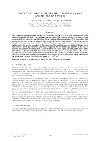 Ziljak Grsic, Jana and Tepes Golubic, Lidija and Peternel, Lana (2022) The way students use graphic design in raising awareness of Covid 19. In: INTED2022: 16th International Technology, Education and Development Conference 7-8 March, 2022.: conference proceedings. IATED Academy, Valencia, pp. 7589-7594. ISBN 978-84-09-37758-9