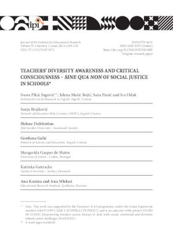 Additional Information: Language: English. - Title in Croatian: Svijest o različitosti i kritička svijest nastavnika – sine qua non ostvarivanja društvene pravde u školama.