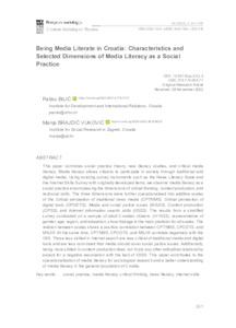 IN ENGLISH: This paper combines social practice theory, new literacy studies, and critical media literacy. Media literacy allows citizens to participate in society through traditional and digital media. Using existing survey instruments such as the News Literacy Scale and the Internet Skills Survey with originally developed items, we observe media literacy as a social practice encompassing the dimensions of critical thinking, content production, and technical skills. The three dimensions were further operationalised into additive scales of the Critical perception of traditional news media (CPTNMS), Critical perception of digital tools (CPODTS), Media and social justice issues (MSJIS), Content production (CPSS), and Internet information search skills (IISSS). The results from a stratified survey conducted on a sample of adult Croatian citizens (n=1033), representative of gender, age, region, and education, show that age is the main predictor for all scales. The relation between scales shows a positive correlation between CPTNMS, CPODTS, and MSJIS. At the same time, CPTNMS, CPODTS, and MSJIS correlate negatively with the IISS. Those less skilled in internet search are less critical of traditional media and digital tools and are less convinced that media should cover social justice issues. Additionally, being more skilled in content production does not imply any other attitudinal relationship except for a negative association with the lack of IISSS. This paper contributes to the operationalisation of media literacy for sociological research and a better understanding of media literacy in the general population of Croatia. --------------- IN CROATIAN: U ovom se radu koriste teorije društvene prakse, nove studije pismenosti i kritike medijske pismenosti. Medijska pismenost omogućuje građanima sudjelovanje u društvu putem tradicionalnih i digitalnih medija. Primjenom odabranih dimenzija postojećih instrumenata kao što su News media literacy scale i Internet skills survey te originalno razvijenih čestica, medijsku pismenost promatramo kao društvenu praksu kritičkog mišljenja, proizvodnje sadržaja i dimenzije tehničkih vještina. Tri su dimenzije dalje operacionalizirane u aditivne ljestvice kritičke percepcije tradicionalnih medija (KPTM), kritičke percepcije digitalnih alata (KPDA), društvene uključivosti u medijima (DUM), proizvodnje sadržaja (PS) i vještina pretraživanja internetskih informacija (PII). Rezultati istraživanja provedenog na uzorku odraslih hrvatskih građana (n=1033) reprezentativnih za spol, dob, regiju i obrazovanje pokazuju da je dob glavni prediktor za sve ljestvice. Odnos između ljestvica pokazuje pozitivnu korelaciju između KPTM-a, KPDA-a i DUM-a. U isto vrijeme, KPTM, KPDA i DUM u negativnoj su korelaciji s PII-jem. Oni manje vješti u internetskom pretraživanju manje su kritični prema tradicionalnim medijima i digitalnim alatima i manje su uvjereni da mediji trebaju pokrivati pitanja društvene uključivosti. Također, biti vještiji u proizvodnji sadržaja ne podrazumijeva nikakav drugi odnos, samo onaj koji se odnosi na negativnu povezanost s nedostatkom PII-ja. Ovaj rad pridonosi operacionalizaciji medijske pismenosti za sociološka istraživanja i boljem razumijevanju medijske pismenosti u općoj populaciji u Hrvatskoj.