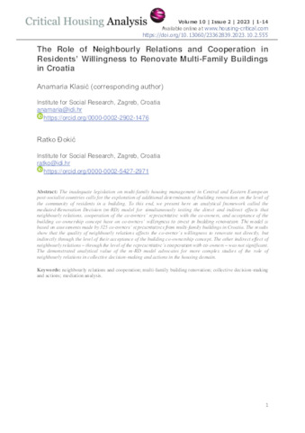 Klasić, Anamaria and Đokić, Ratko (2023) The role of neighbourly relations and cooperation in residents’ willingness to renovate multi-family buildings in Croatia. Critical housing analysis, 10 (2). pp. 1-14. ISSN 2336-2839