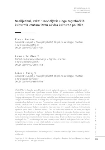Kardov, Kruno and Klasić, Anamaria and Ostojić, Jelena (2023) Naslijeđeni, važni i nevidljivi: uloga zagrebačkih kulturnih centara izvan okvira kulturne politike. Sociologija i prostor, 61 (2). pp. 281-301. ISSN 1846-5226 (Print), 1849-0387 (Online)