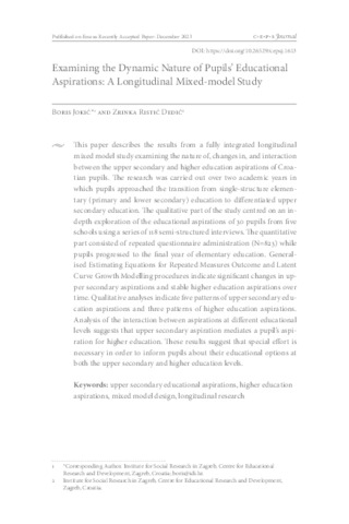 Jokić, Boris and Ristić Dedić, Zrinka (2023) Examining the dynamic nature of pupils’ educational aspirations: a longitudinal mixed-model study. Center for Educational Policy Studies Journal. pp. 1-27. ISSN 1855-9719 (Print), 2232-2647 (Online)