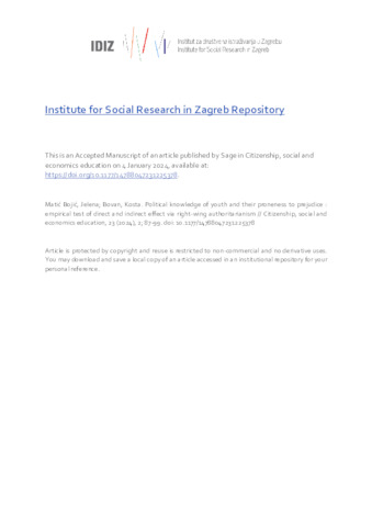 | Additional Information: | Language: English. - Title in Croatian: Političko znanje mladih i njihova sklonost predrasudama: empirijska provjera izravnog i neizravnog efekta povezanosti putem desne autoritarnosti. |