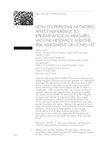 | Additional Information: | Language: Engish. - Title in Croatian: Kako osobne mreže utječu na pridržavanje epidemioloških mjera, namjeru necijepljenja i procjenu rizika od COVID-19? |
