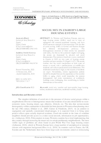 Klasić, Anamaria and Svirčić Gotovac, Anđelina (2024) Social mix in Zagreb’s large housing estates. Economics and sociology, 17 (3). pp. 119-134. ISSN 2071-789X (Print), 2306-3459 (Online)