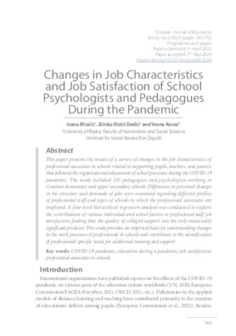 Miočić, Ivana and Ristić Dedić, Zrinka and Kovač, Vesna (2024) Changes in job characteristics and job satisfaction of school psychologists and pedagogues during the pandemic. Croatian journal of education, 26 (3). pp. 763-779. ISSN 1848-5189 (Print), 1848-5197 (Online)
