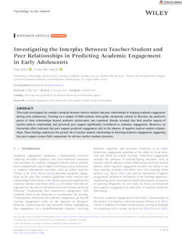 IN ENGLISH: This study investigates the complex interplay between teacher–student and peer relationships in shaping academic engagement during early adolescence. Drawing on a sample of 6048 students from public elementary schools in Slovenia, the predictive power of these relationships beyond academic achievement was examined. Results revealed that both positive aspects of teacher–student relationships and perceived peer support significantly contributed to academic engagement. Moreover, an interaction effect indicated that peer support predicted engagement only in the absence of negative teacher–student relationships. These findings underscore the pivotal role of teacher–student relationships in fostering academic engagement, suggesting that peer support cannot fully compensate for adverse teacher–student dynamics. --------------- IN CROATIAN: Ova studija istražuje kako međudjelovanje odnosa učenika s nastavnicima i vršnjacima oblikuje učeničku akademsku angažiranost tijekom rane adolescencije. Na uzorku od 6048 učenika javnih osnovnih škola u Sloveniji ispitana je prediktivna moć tih odnosa povrh doprinosa akademskog uspjeha. Rezultati su pokazali da su i pozitivni aspekti odnosa učenika i nastavnika, kao i percipirana vršnjačka podrška, značajno doprinijeli akademskoj angažiranosti. Štoviše, učinak interakcije pokazao je da vršnjačka podrška predviđa angažiranost samo u odsutnosti negativnih aspekata odnosa učenika i nastavnika. Ovi nalazi naglašavaju ključnu ulogu odnosa učenika i nastavnika u poticanju akademske angažiranosti, sugerirajući da vršnjačka podrška ne može u potpunosti kompenzirati nepovoljnu dinamiku između učenika i nastavnika.