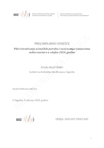 Pilot istraživanje učeničkih potreba i suočavanja s izazovima online nastave u ožujku 2020. godine : preliminarno izvješće