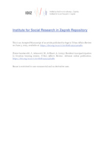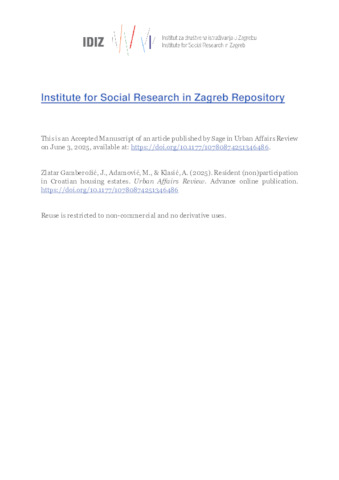 Zlatar Gamberožić, Jelena and Adamović, Mirjana and Klasić, Anamaria (2025) Resident (non)participation in Croatian housing estates. Urban affairs review. pp. 1-29. ISSN 1078-0874 (Print), 1552-8332 (Online)