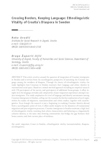 IN ENGLISH: This article revolves around the question of integration of Croatian immigrants in Sweden and is written from the sociolinguistic perspective of sustaining the Croatian language among the members of diaspora. Through the theory of ethnolinguistic vitality, the study highlights how Croatians in Sweden maintain their language and ethnic identity in transnational social space. Based on a mixed-method approach including an empirical research with 150 participants of the survey, and participants of additional focus-groups, it offers insights into the language attitudes and complexities of post-migration experiences among Croatian immigrants. The study emphasizes the level of language and identity sustainment among Croatian immigrants in Sweden, calling out the necessity for further exploration of such topics within the realms of migration, transnationalism and ethnic studies, together with sociolin-guistics. Even though this research is just a beginning in studying Croatian identity abroad from a sociolinguistic point of view, it offers useful insights on the dynamics of transnational migration and post-migration processes. Croatian immigrants in Sweden maintain a high level of ethnolinguistic vitality, retaining their ethnic characteristics and behaving as a linguistically cohesive identity, at the same time forming communities that bridge the gap between their home country and their current place of residence. --------------- IN CROATIAN: Ovaj se članak bavi pitanjem integracije hrvatskih imigranata u Švedskoj. Napisan je iz sociolingvističke perspektive s ciljem očuvanja hrvatskog jezika među članovima dijaspore. Kroz teoriju etnolingvističke vitalnosti, istraživanje prikazuje kako Hrvati u Švedskoj održavaju svoj jezik i etnički identitet u transnacionalnom društvenom prostoru. Na temelju pristupa mješovitih metoda, koji uključuje empirijsko istraživanje sa 150 sudionika ankete te dodatne fokus grupe, članak pruža uvid u jezične stavove i složenosti postmigracijskih iskustava među hrvatskim imigrantima. Istraživanje naglašava važnost očuvanja jezika i identiteta među hrvatskim imigrantima u Švedskoj te ističe potrebu za daljnjim istraživanjima ovakvih tema u okviru migracijskih, transnacionalnih i etničkih studija, kao i sociolingvistike. Iako se ovo istraživanje može shvatiti tek kao početak proučavanja hrvatskog identiteta u inozemstvu iz sociolingvističke perspektive, nudi korisne uvide u dinamiku transnacionalne migracije i postmigracijskih procesa. Hrvatski imigranti u Švedskoj zadržavaju visoku razinu etnolingvističke vitalnosti, čuvajući svoje etničke karakteristike i ponašajući se kao jezično kohezivna zajednica, istovremeno stvarajući zajednice koje premošćuju jaz između njihove domovine i trenutnog mjesta boravka.
