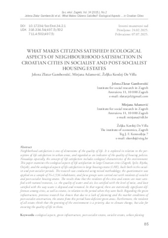Zlatar Gamberožić, Jelena and Adamović, Mirjana and Kordej-De Villa, Željka (2025) What makes citizens satisfied?: ecological aspects of neighbourhood satisfaction in Croatian cities in socialist and post-socijalist housing estates. Socijalna ekologija, 34 (2). pp. 85-110. ISSN 1330-0113 (Print) ISSN 1849-0360 (Online)