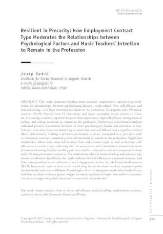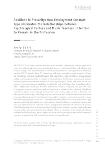 Additional Information: Language: English. - Title in Croatian: Otporni u prekarijatu: kako vrsta ugovora o radu moderira veze psiholoških čimbenika i namjere ostanka u profesiji nastavnika glazbe.
