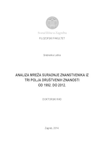 Letina, Srebrenka (2014) Analiza mreže suradnje znanstvenika iz tri polja društvenih znanosti od 1992. do 2012. PhD thesis, Filozofski fakultet Sveučilišta u Zagrebu.