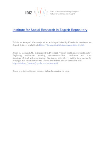 Ančić, Branko and Domazet, Mladen and Župarić-Iljić, Drago (2019) “For my health and for my friends”: exploring motivation, sharing, environmentalism, resilience and class structure of food self-provisioning. Geoforum, 106. pp. 68-77. ISSN 0016-7185 (Print), 1872-9398 (Online)
