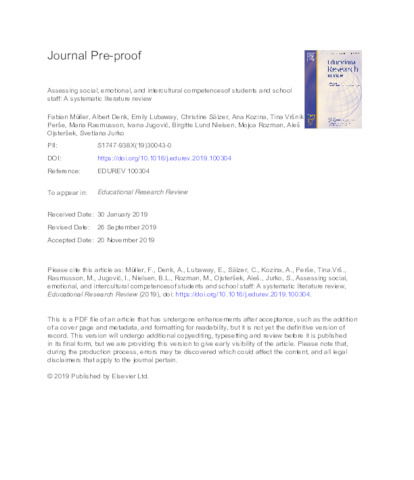 Müller, Fabian and Denk, Albert and Lubaway, Emily and Sälzer, Christine and Kozina, Ana and Vršnik Perše, Tina and Rasmusson, Maria and Jugović, Ivana and Lund Nielsen, Birgitte and Rozman, Mojca and Ojsteršek, Aleš and Jurko, Svetlana (2020) Assessing social, emotional, and intercultural competences of students and school staff: a systematic literature review. Educational research review, 29. pp. 1-24. ISSN 1747-938X