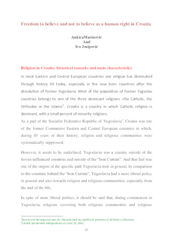Marinović, Ankica and Josipović, Ivo (2019) Freedom to believe and not to believe as a human right in Croatia. Religions (12). pp. 67-77. ISSN 2218-7480