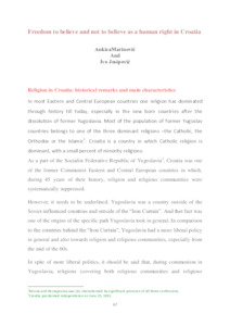 IN ENGLISH: Freedom to believe and not to believe is guaranteed by the Croatian Constitution. This paper will consider some cases of positive and negative praxis of respecting/violating of this right at the example of some minority religious communities and irreligious people in Croatia. Paper covers the next main points: religious situation in Croatia, legal framework of the state - Church (religious communities) relationship, examples of respecting religious freedom and examples of violating the right to religious freedom in the state, political and civil society. Conclusions will show that Croatia has developed a model which privileges the Catholic Church, accepts and cooperates with some other traditional religious communities, but occasionally discriminates against some other religion, and people with different religious and irreligious convictions. --------------- IN CROATIAN: Sloboda vjerovanja i nevjerovanja garantirana je hrvatskim Ustavom. Ovaj rad razmatra primjere pozitivne i negativne prakse poštivanja/kršenja tih prava na primjeru manjih vjerskih zajednica i kategorije nereligioznih ljudi u Hrvatskoj. Rad se bavi sljedećim temama: religijskom situacijom u Hrvatskoj, pravnim okvirom odnosa između države i Crkve (vjerskih zajednica), primjerima poštivanja vjerske slobode i primjerima kršenja prava na vjersku slobodu u državi, političkom i civilnom društvu. Zaključci pokazuju da Hrvatska razvija model koji privilegira Katoličku crkvu, koji prihvaća suradnju s nekim drugim tradicionalnim vjerskim zajednicama, ali povremeno diskriminira neke druge zajednice i ljude s drugačijim religioznim i nereligioznim uvjerenjima.