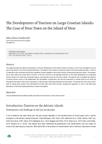 IN ENGLISH: This paper examines the special characteristics of tourism development on the Adriatic islands, focusing on Hvar Town, the largest town and port on the island of Hvar and its busiest destination. The research was carried out using the method of semi-structured interviews. A total of 30 interviews were conducted with the local residents (mostly employed in the tourism sector) and temporary/seasonal visitors. The intention was to learn about the current state of tourism in the town and look at the possible scenarios for the future development of sustainable tourism, based on its three inter-connected aspects: environmental, economic and socio-cultural. The research also considered the influence of various tourism actors on the development, the possibilities of agritourism, the role and importance of cultural tourism and, finally yet importantly, the impact of the Covid-19 pandemic on the last year's drastically shortened summer season. The results show that mass tourism (and its subset party tourism) have dominated the tourist offer since 2000 onwards, changing the reputation of Hvar as the elite travel destination or the family holiday destination it used to have before. --------------- IN CROATIAN: Ovim se radom istražuju specifične karakteristike turističkog razvoja na jadranskim otocima i to konkretno na primjeru grada Hvara na otoku Hvaru kao najvećem gradu na otoku Hvaru te najposjećenijoj destinaciji na otoku. Istraživanje je provedeno kroz metodu polustrukturiranih intervjua. Provedeno je 30 intervjua koji su obuhvaćali stalne i sezonske stanovnike mjesta kao i različite tipove aktera; od predstavnika lokalne zajednice do radnika u turizmu. Nastojalo se odrediti postojeće stanje turizma u gradu Hvaru kao i potencijalne scenarije za njegov daljnji razvoj kroz različite dimenzije održivog razvoja, dakle ekonomsku, ekološku, socijalnu i kulturnu dimenziju održivosti. Istražilo se kakav je i koliki utjecaj pojedinih aktera na turistički razvoj, na koji su način povezane poljoprivreda i turizam u vidu agroturizma; postoje li i na koji su način osmišljeni aspekti kulturnog turizma te koliko je utjecala pandemija COVID-19 na turističku sezonu. Rezultati pokazuju kako je masovni turizam (i, uz njega, party turizam) preuzeo veći dio turističke ponude od 2000. godine nadalje. Turistički je razvoj tekao slobodno. tj. stihijski u smjeru masovnosti, zamjenjujući dotadašnje tipove turizma kao i reputaciju Hvara kao odredišta luksuznog (elitnog) i obiteljskog turizma.